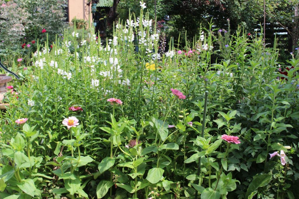 トラノオと百日草 宿根草とこぼれ種どちらも手間いらず。 あえて増えすぎたら除草の対象になります。(笑)