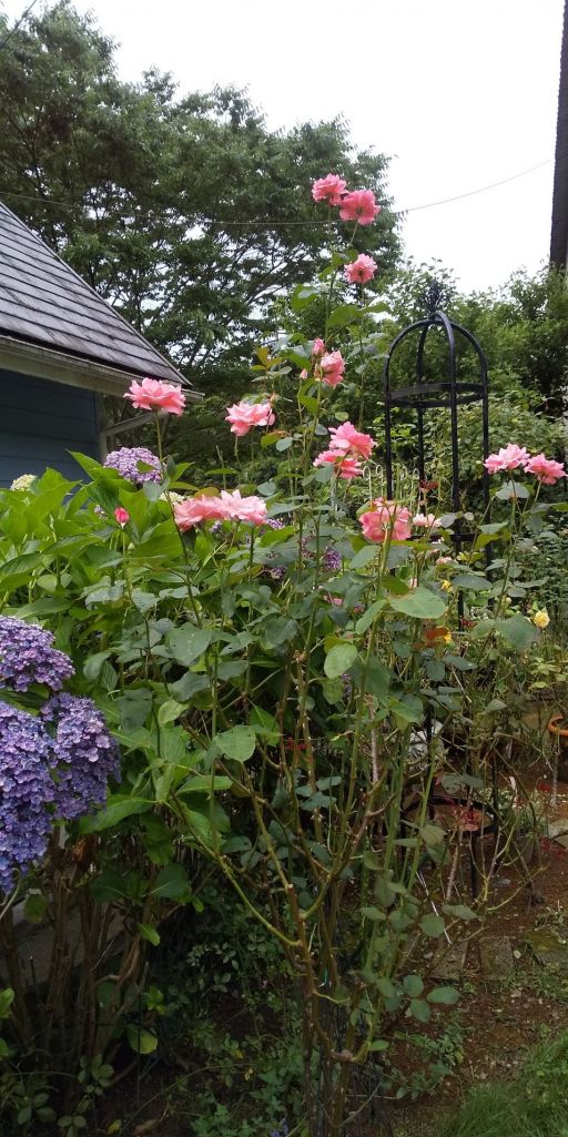 一番花のカット失敗かな?背の高い二番花になりました。後ろ紫陽花やグリーンアイスの薔薇は少し日陰に・・・