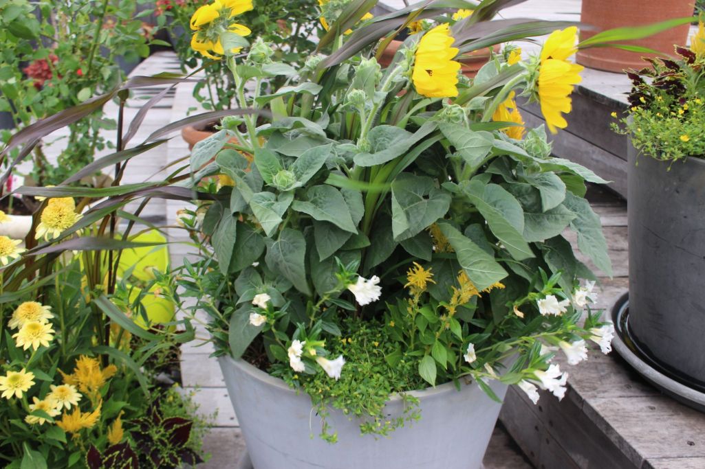 西部池袋本店の9階 空中庭園の寄せ植え ひまわりの下に植栽されてる白いミムラス (オーランティアス)はエフメールさんの苗で東京オリンピックのため暑さや蒸れに強いように開発されました。 黄色の小花メカルドニアも同様です。