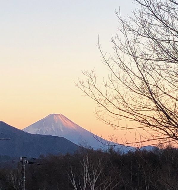 南の空に浮かぶ富士山。 西日が当たり茜色に染まっています。