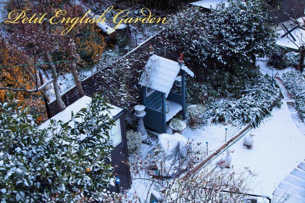 庭が真っ白になって、レモンマリゴールドの鮮やか黄色もちょっとくすんで見えます・・