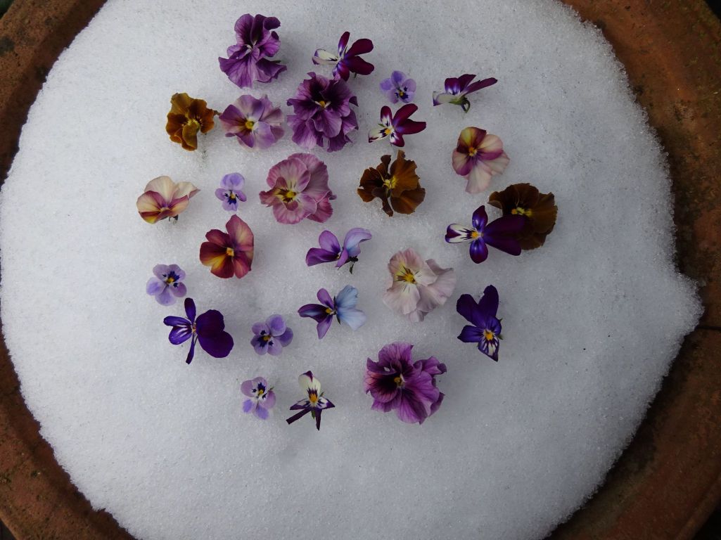 自粛中、ネットガーデン巡りをしていたら素敵な写真を見つけました。私も真似して大きなコンテナの雪の上にビオラを並べて遊んでみました。今年は個人育種家のビオラの虜になっています。