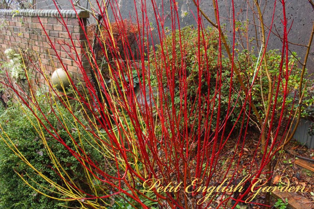 サンゴミズキとオウゴンミズキが大きく育ってさみしい冬の庭を鮮やかに彩ります・・