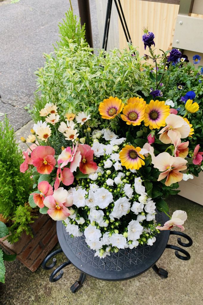 八重カンパニュラホワイトと八重咲オダマキの寄せ植え