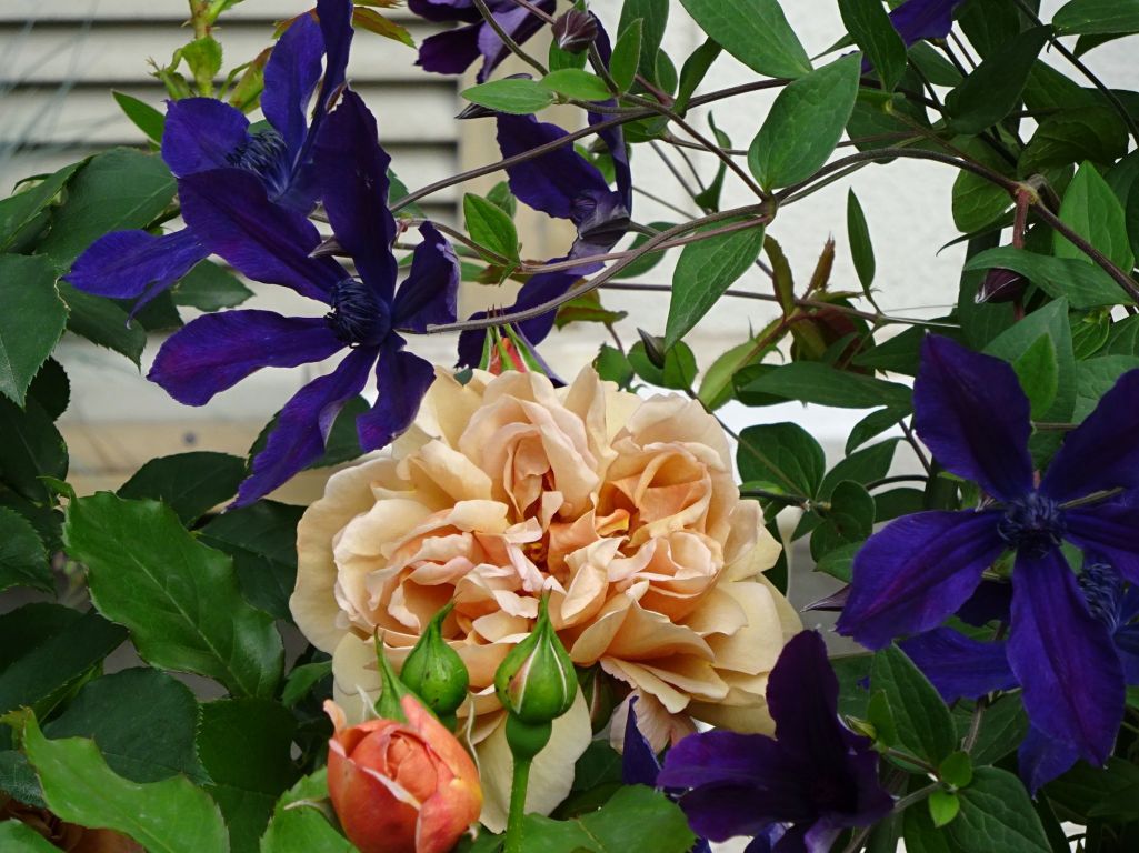 クレマチス アフロディーテエレガフミナと薔薇 カフェ