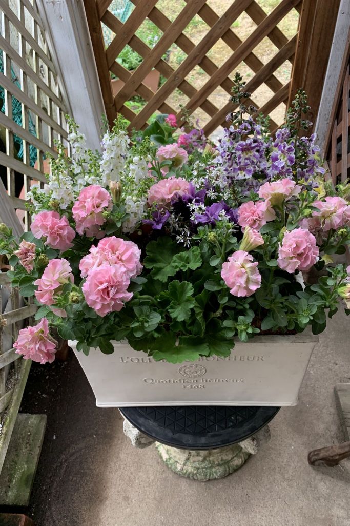 スーパーゼラニュウムチャンピオン(キャロル) ヒューケラドルチェ(チェリーコンポート) ペチュニアホイップマカロン(サーモンピンク) ユーホルビアダイアモンドスター ラベンダーパープルサマー アンゲロニアセレニータ(ホワイト) アンゲロニアエンジェルス(バイカラー)