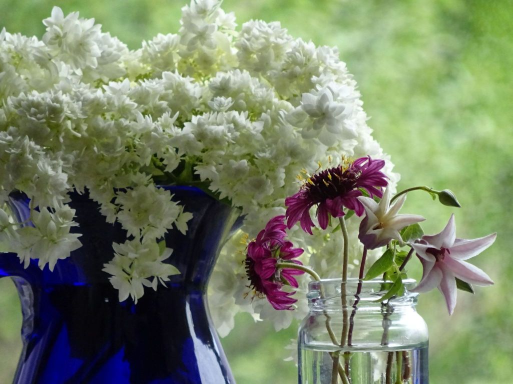 アジサイ・ヘイズスターバースト 開花が進むにつれてグリーンから白へ、ふんわりした感じになってきました。 クレマチス・プリンセスケイトとガイラルディアグレープセンセーション