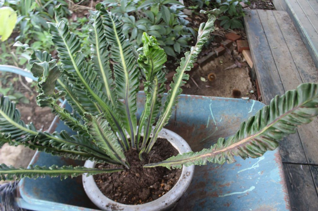 庭の木陰の避暑地にいた観葉植物を越冬小屋へ移動する
