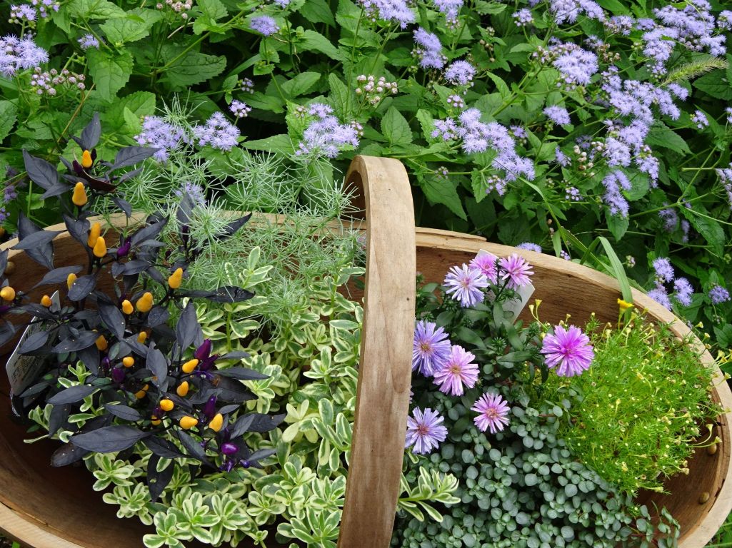 寄せ植えの苗を購入・・・アスター、白花斑入りポーチュラカ、コットンキャンディ、ダールベルクデージー、みもとうからし(見元園芸)など。 庭はこの時期、ユーパトリューム(青色フジバカマ)の、ふんわりした青花が美しい。