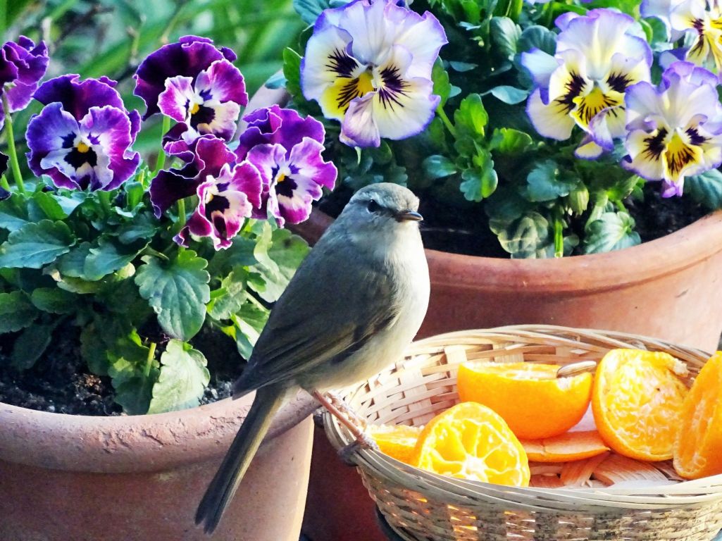 ミカンが大好きなウグイス(^^♪ 見元園芸のビオラをバックに。