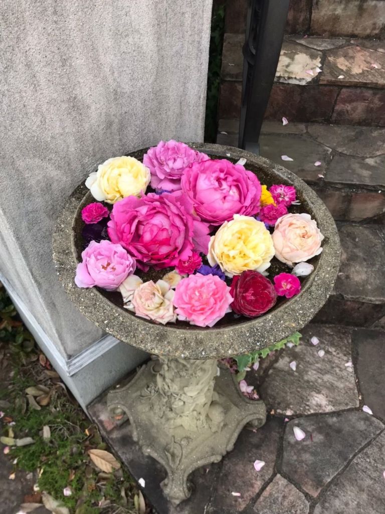 摘んだバラをバードバスに浮べて