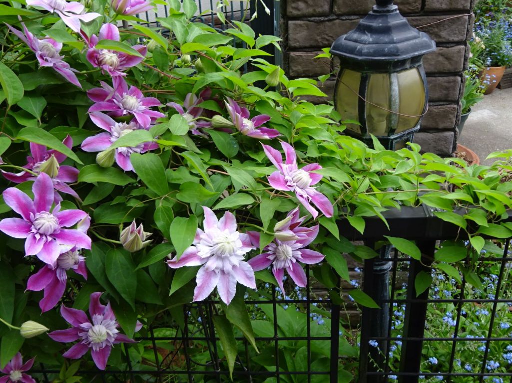クレマチス ジョセフィーヌ とてもエレガントな雰囲気の花、外側の花弁が散っても中心部が残るので長く楽しめます。