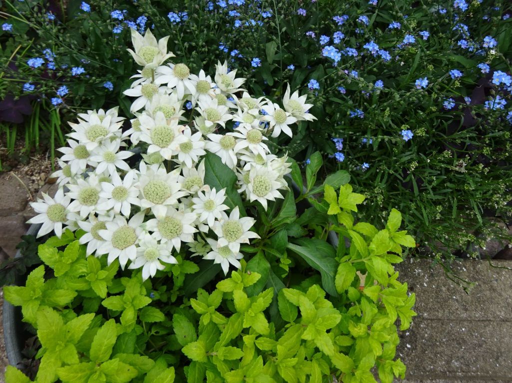 黄金葉の美しいベロニカとフランネルフラワー、ワスレナグサ