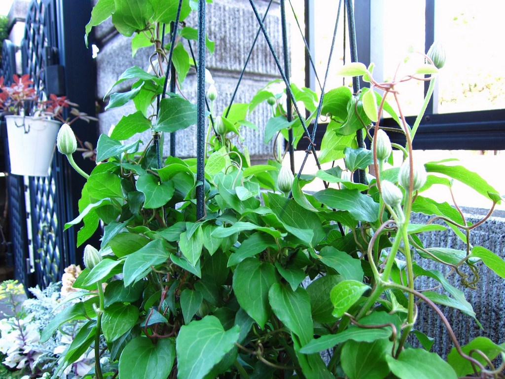 どんどん芽が伸びてオベリスクはぎゅうぎゅう詰め、でもたくさんの蕾がこんなに膨らんできました。花は名前の通り純白です。