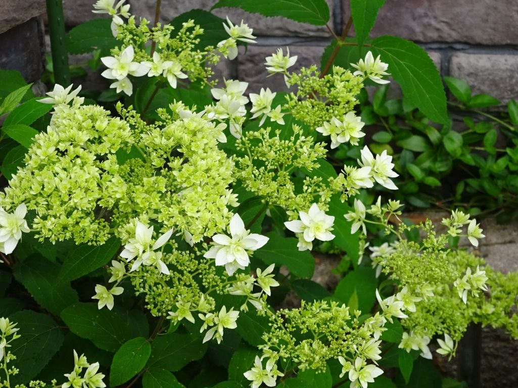 ヘイズスターバースト・・・咲き始めはガクアジサイのようですが手毬状になり、グリーンから白、グリーンへと長い期間楽しむ事ができる。 植えて20年位なります。