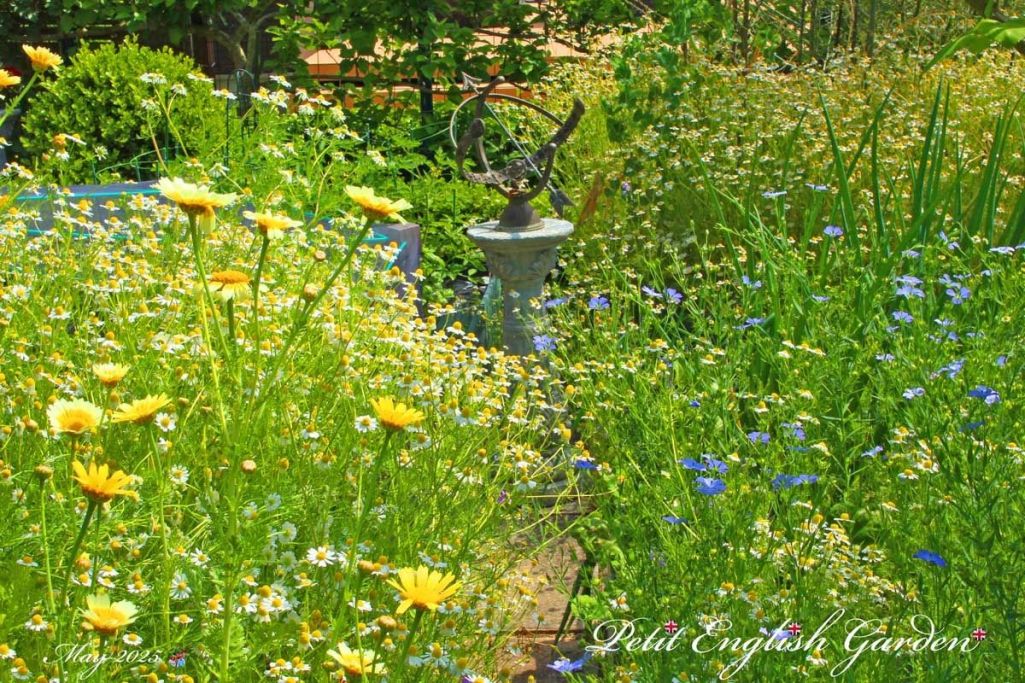 カモミール、亜麻の花が咲く5月のポタジェガーデン、左手前はシュンギクの花です。一部分を写すことで広いメドーガーデンのように見えます。日時計がフォーカルポイントです