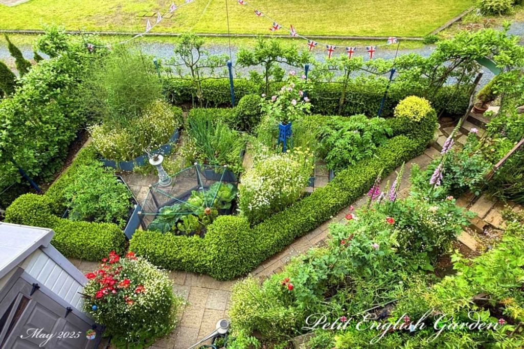 2012年にイギリス旅行直後から作り始めたこのポタジェガーデンも今年で14年目になりました。木でつくった五角形のフレームも朽ちて、新しく簡易なフレームを考案して黒い細かなネットをかぶせて刃物野菜の虫よけにして、庭の新しい構造物になっています。2枚前のメドーガーデンの写真はこの右側から撮影したものです。