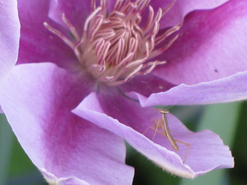 わぁ~、大きなクレマチスにちっちゃなカマキリ!カマキリなら大歓迎ですよね♪