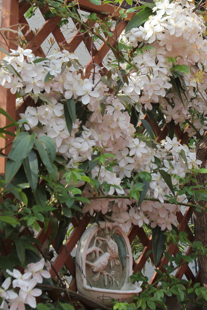 あ~、これも羨ましい~。我が家のモンタナは10年物のピンク(これは寿命?)も3年目の白も今年枯れてしまいました。アーマンディ、いいですね。気を取り直してまた育てます!バードフィーダーも素敵です!