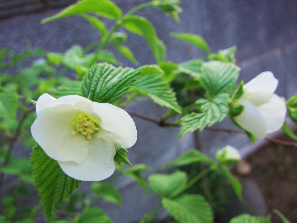 白ヤマブキ。黄色のヤマブキとは雰囲気が大分違います。ひっそりと咲いていました。