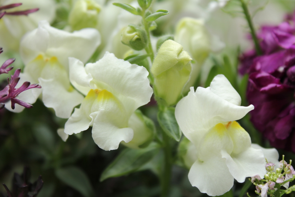 キンギョ草がこんなに素敵だなんて、すっかり見直してしまいました。♪赤紫とのコンビネーションがいいですね。