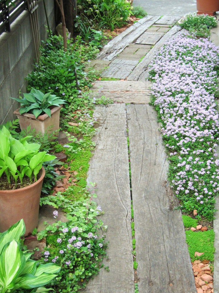 タイムがとてもきれいですね。繁殖力旺盛できっと枕木のほうにどんどん広がってくると思いますがいつごろの季節に切り戻していますか?ホスタもすごい充実した株ですね。
