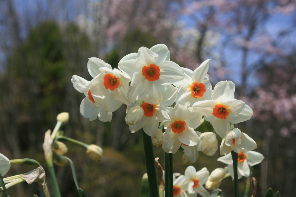 かわいいスイセンと、バックのピンクのお花と青空と、とっても素敵な組み合わせですね♪幸せな気持ちになります♪