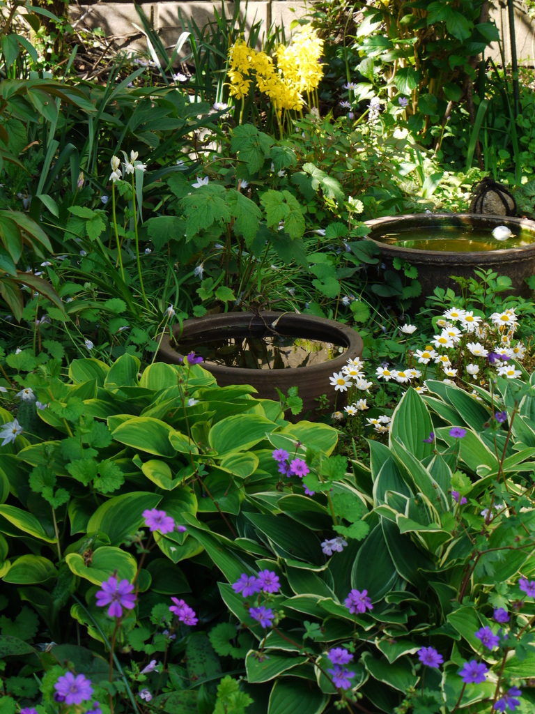 黄金もいいですが、私は手前の紫のゲラニウムが緑の中でよく映えてると思います。しっとりしたいい雰囲気ですね。水鉢の中には何かいるのですか?