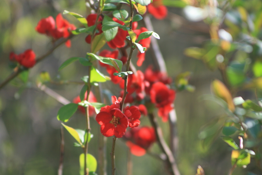 ボケはそれまでなにもなかった枝に花と新緑が同時に現れるのがうれしいですね。