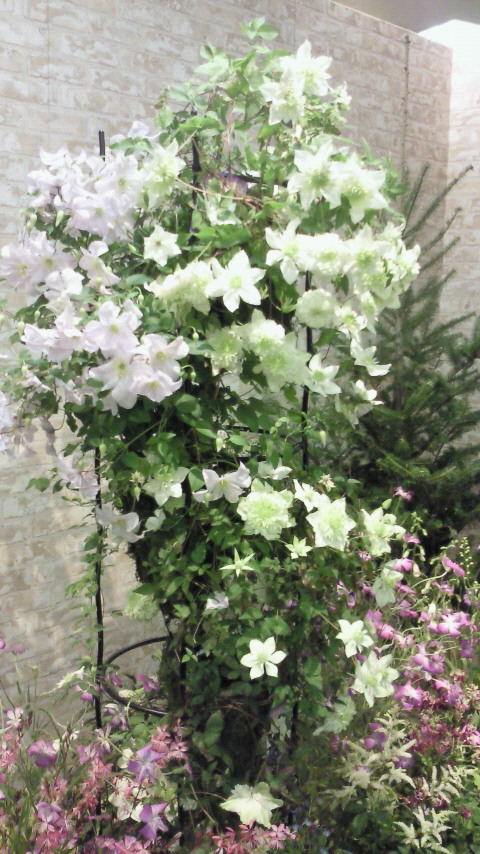 クレマチスがとても綺麗です♪違う品種の白を絡ませてあり品がありますよね〜(^_-)