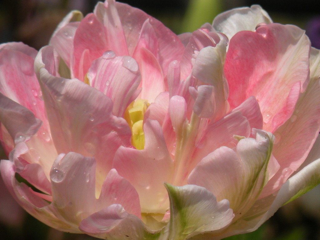 とっても華やかなチューリップですね。なんともきれいなピンク色、クリーム色のしべもちらっと見えて、こんな風に開いた姿もいいものですね。強風に負けないで~!
