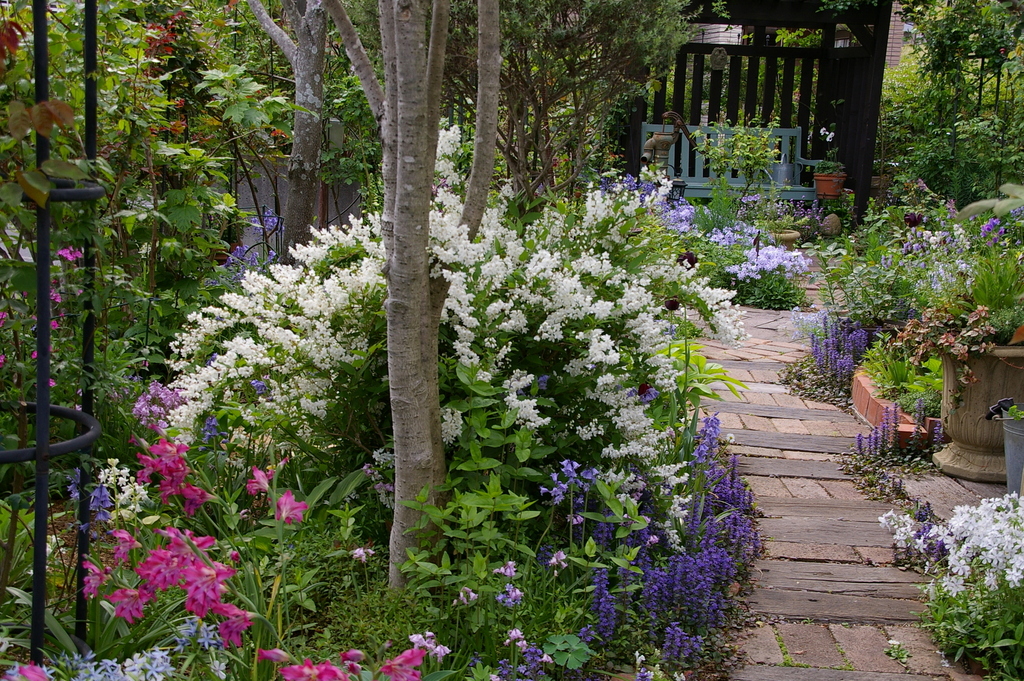 素敵な小道ですね~白い花はヒメウツギでしょうか?洗練されたお庭でウットリです♪