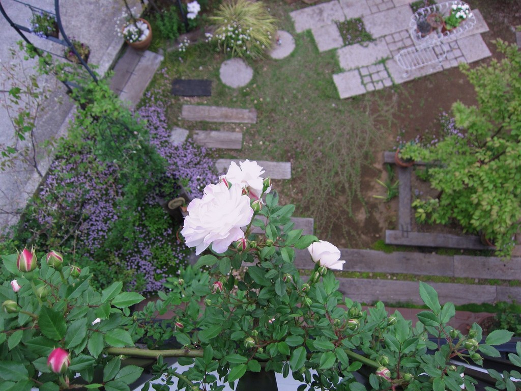 二階のベランダの手すりまで誘引しているオドラータが咲きはじめました。