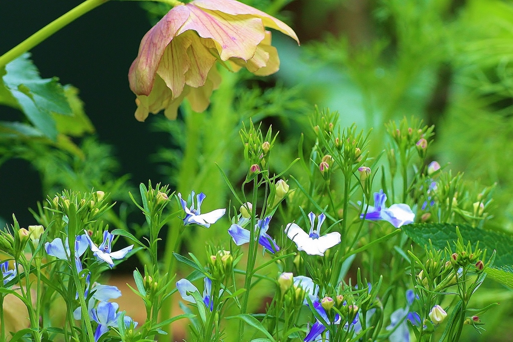 クリスマスローズが小花(ロベリアでしょうか?)を見つめてる素敵なシーンですね。♪