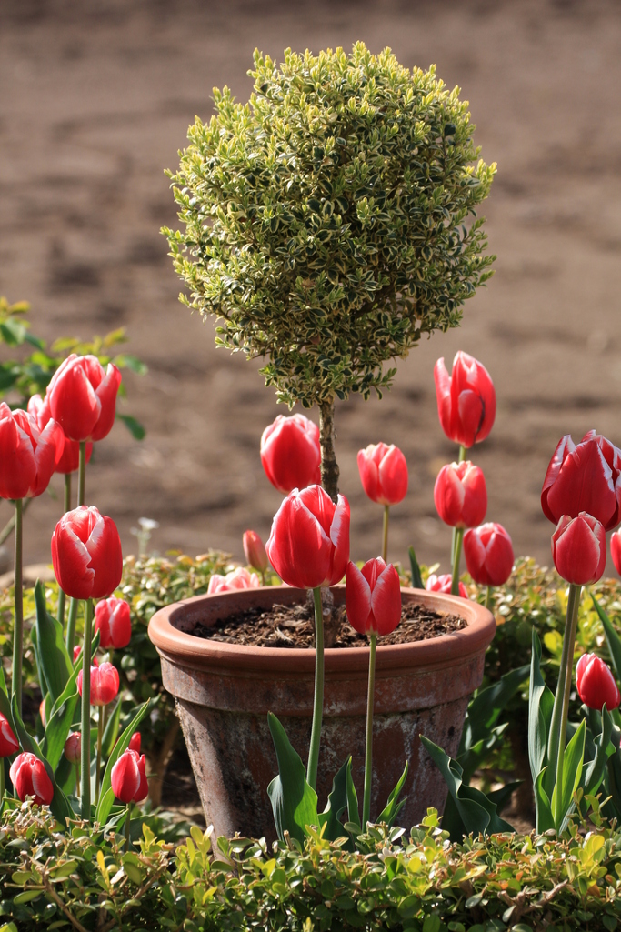 可愛いチューリップの中のトピアリー、なんて素敵な組み合わせ!見ていてとっても幸せな気持ちになります。