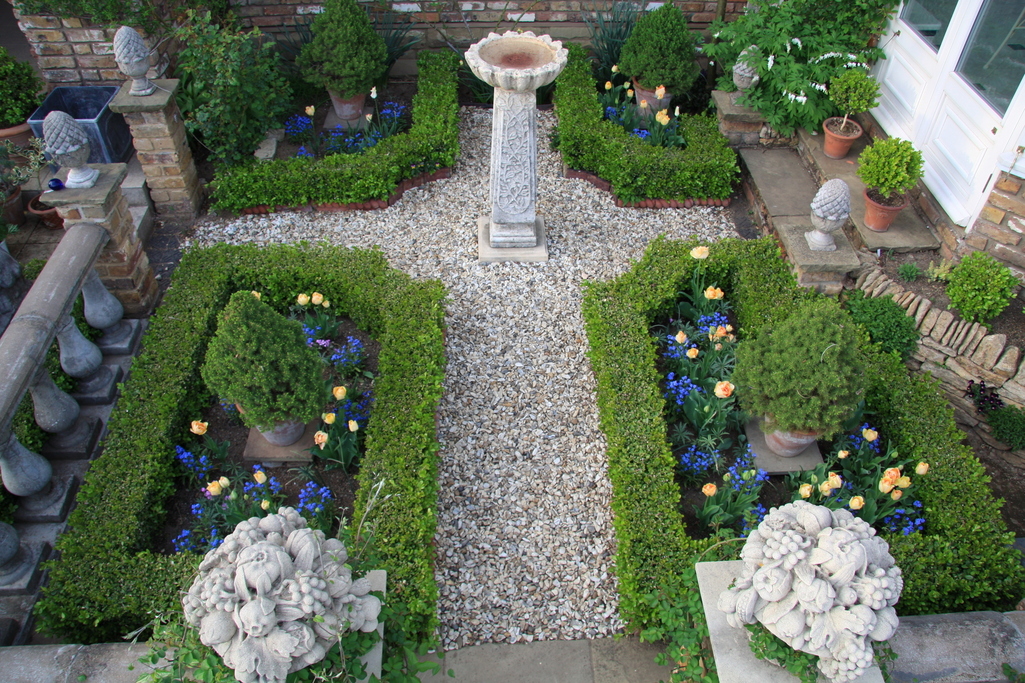 素敵なフォーマルガーデンですね。緑の縁取りにブルーがよく合っています。