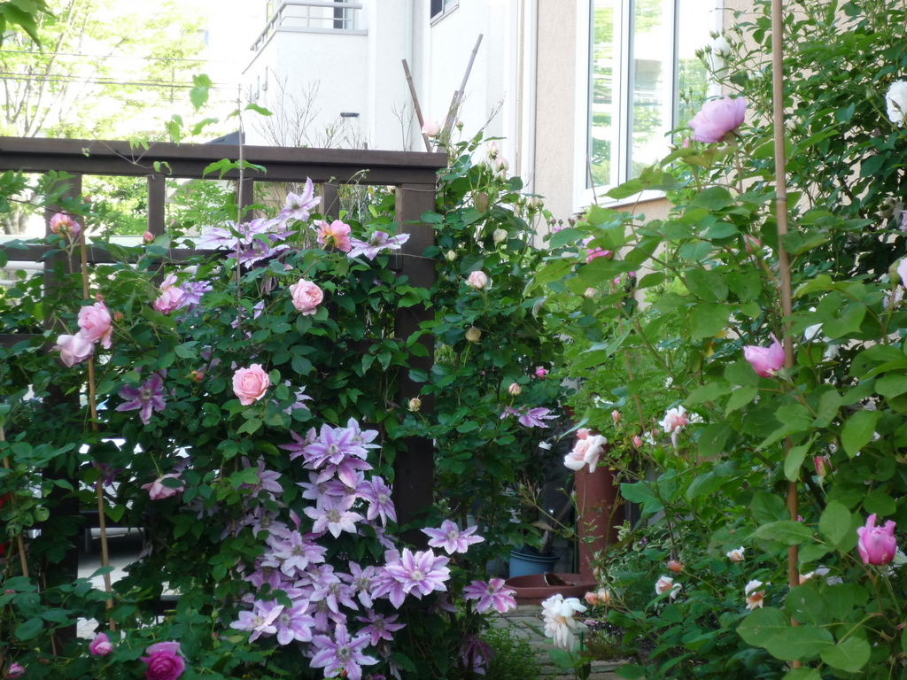 小さいながらも、自慢のガーデンなのです。基本は バラ。クレマチスはポイントで配置しています。バラ苗は切り花品種を中心に約150以上の品種を所有しているのでホント~ 彩り華やかなのですょ~っ。柵は レッドウッドの木組みで近くにあるカーブドッヂ ワイナリーの木組み柵を参考にしているんですょ~。画像は昨年のものですが、今年は 昨年よりも 樹勢が素晴らしく良いので、咲っプリに期待しております。6月に向けて、撮影技術も磨きつつ、庭の手入れに 汗を流していま~す!!