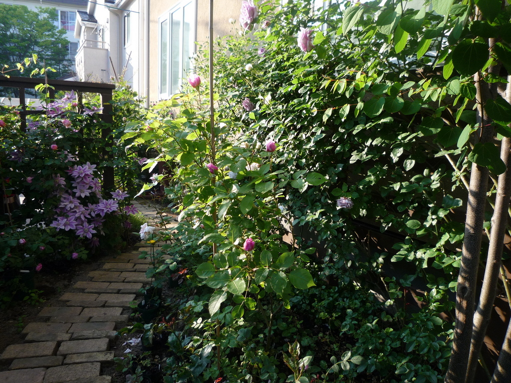 小さいながらも、自慢のガーデンなのです。基本は バラ。クレマチスはポイントで配置しています。バラ苗は切り花品種を中心に約150以上の品種を所有しているのでホント~ 彩り華やかなのですょ~っ。柵は レッドウッドの木組みで近くにあるカーブドッヂ ワイナリーの木組み柵を参考にしているんですょ~。画像は昨年のものですが、今年は 昨年よりも 樹勢が素晴らしく良いので、咲っプリに期待しております。6月に向けて、撮影技術も磨きつつ、庭の手入れに 汗を流していま~す!!