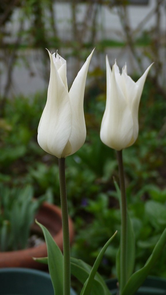 チューリップのサッポロです。純白の花が大好きなんです。仲良くすっくと立ち咲いている姿が中良しさんですね。