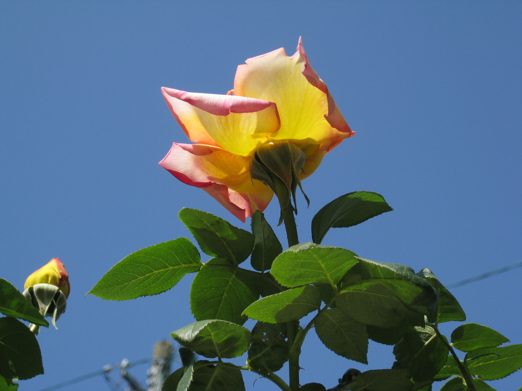 つるピースでした。パーゴラの上で 空に向かって元気よく咲いていたから 背伸びして撮りました♪電線はアクセントです(笑)