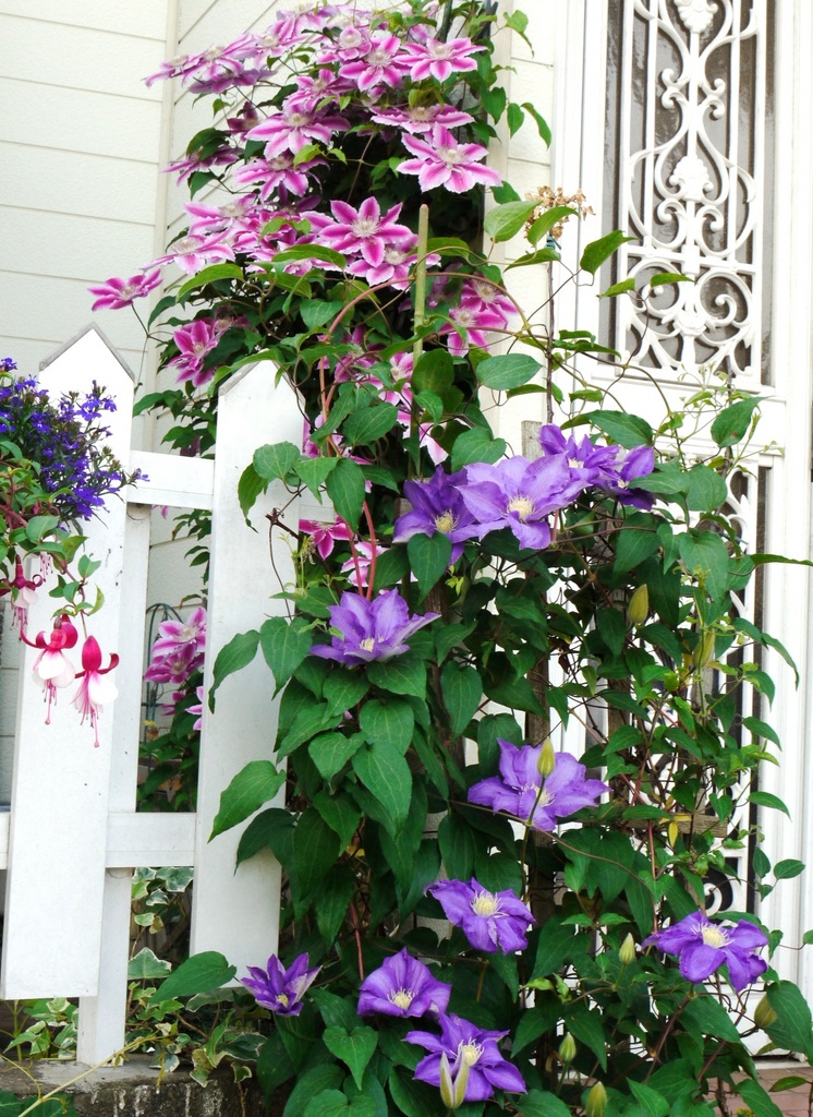 すっきり目に入ってくる力のある写真ですね。二種類のクレマチス、この組み合わせグッド。