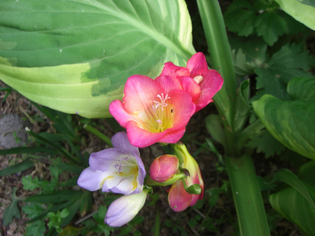 ギボウシの葉影に・・・ フリージアが・・^^