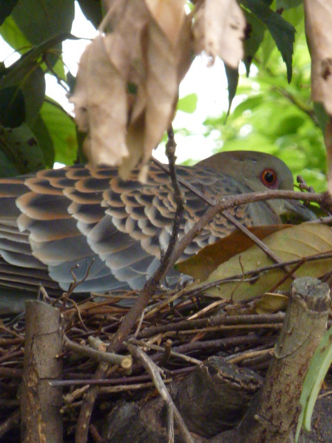 あ~~~っ、いっぺいさん!キジバトさん、子育て中ではないですか?これ以上剪定しないでくださいね。あと、数週間だけがまんしてくださいね。お願い。ペコリ。これは、減点ですね!