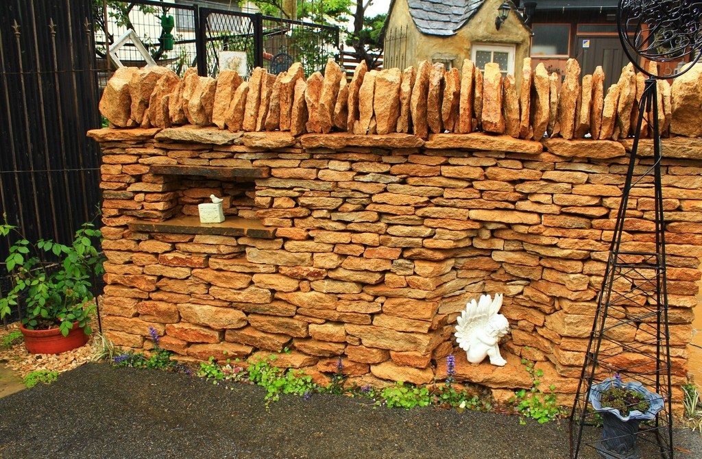 この石積みはモルタルを使わないで積み上げています。力いっぱい押しても、上に乗ってもビクともしません♪雨に濡れて深みのある色になっています。う~ん、素敵です♪