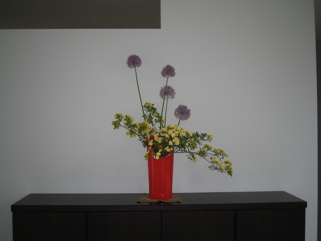 玄関に庭に咲いていたアリウムとモッコウバラを生けました。