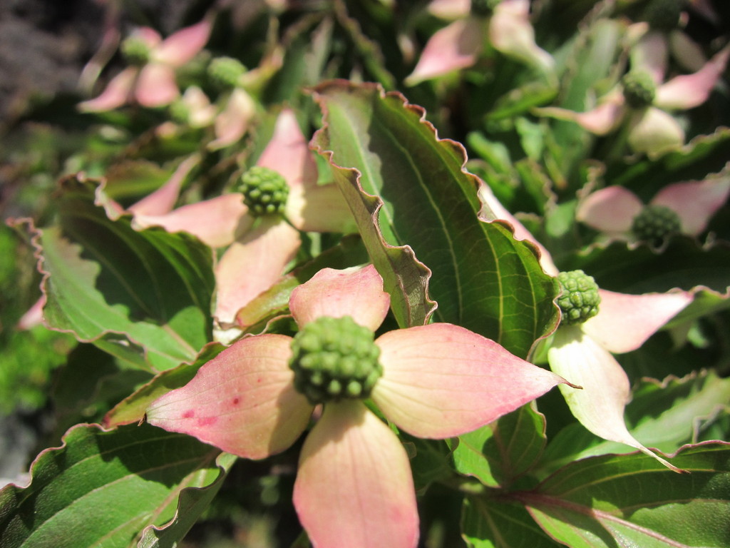 紅花のヤマボウシです。鉢植えですが、小さな花をびっしりと付けています。