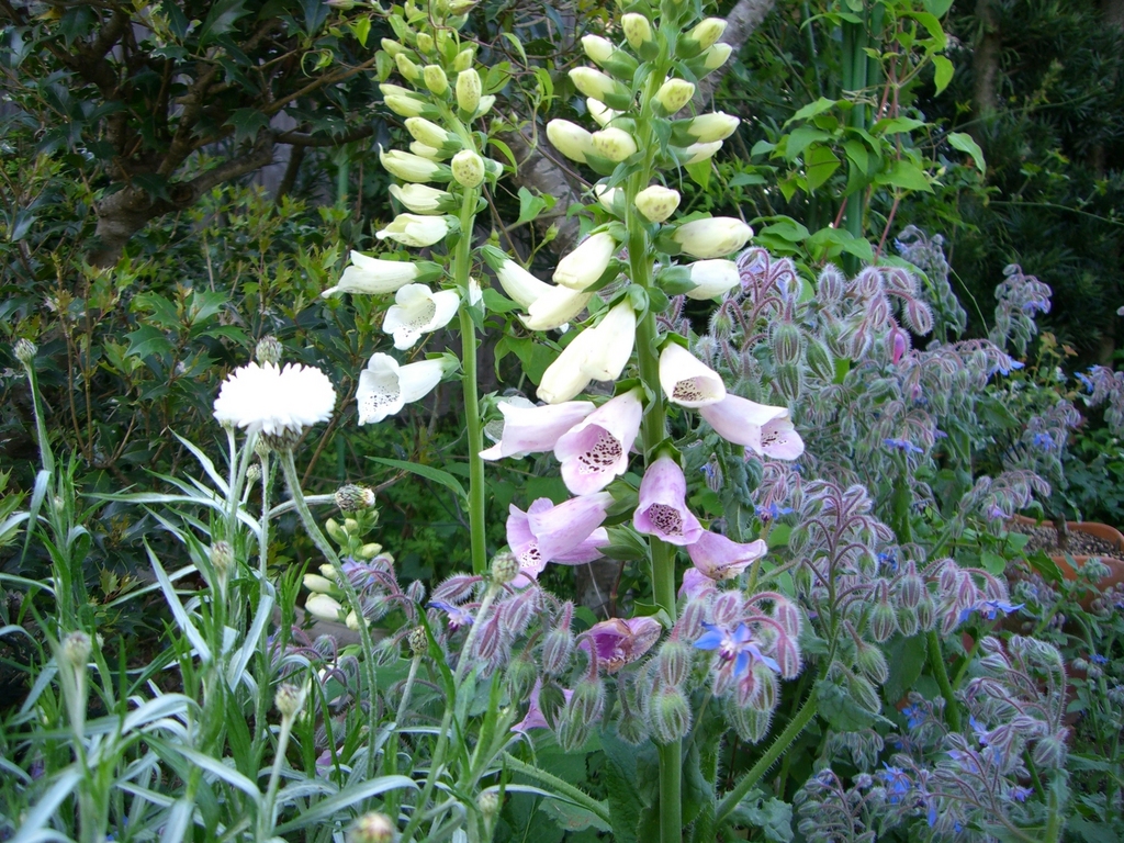 ジキタリスとこぼれ種のボリジ、矢車草