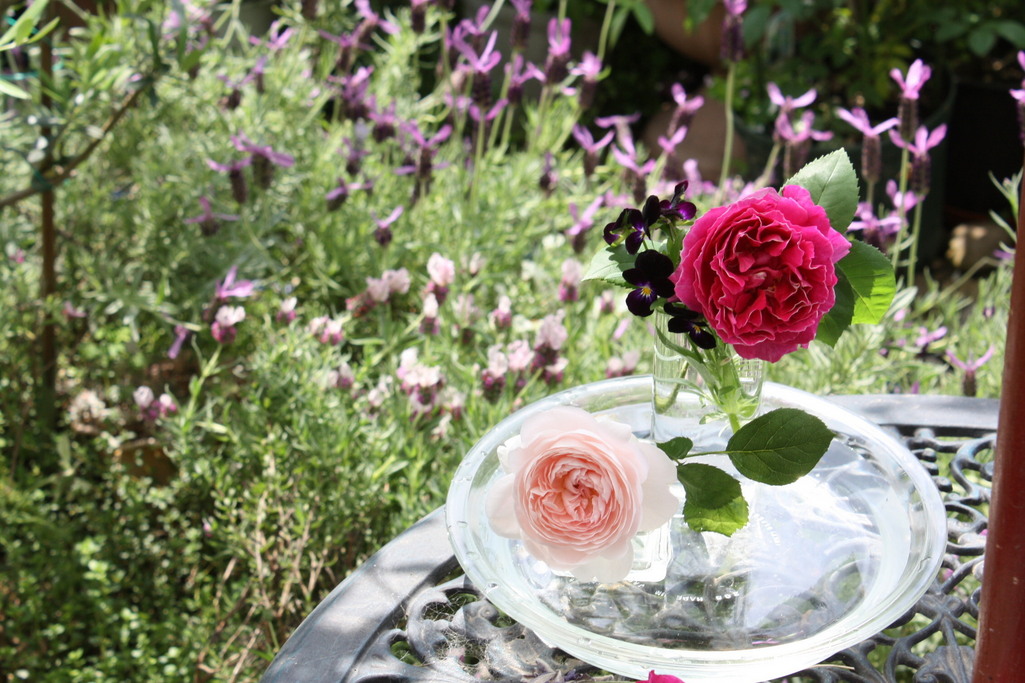庭の奥まったところで咲いてるので、切って家の中に持ち込みます。玄関の脇で咲いているクイーン・オブ・スエーデンも一緒に・・・女王様と男爵ペアのです。