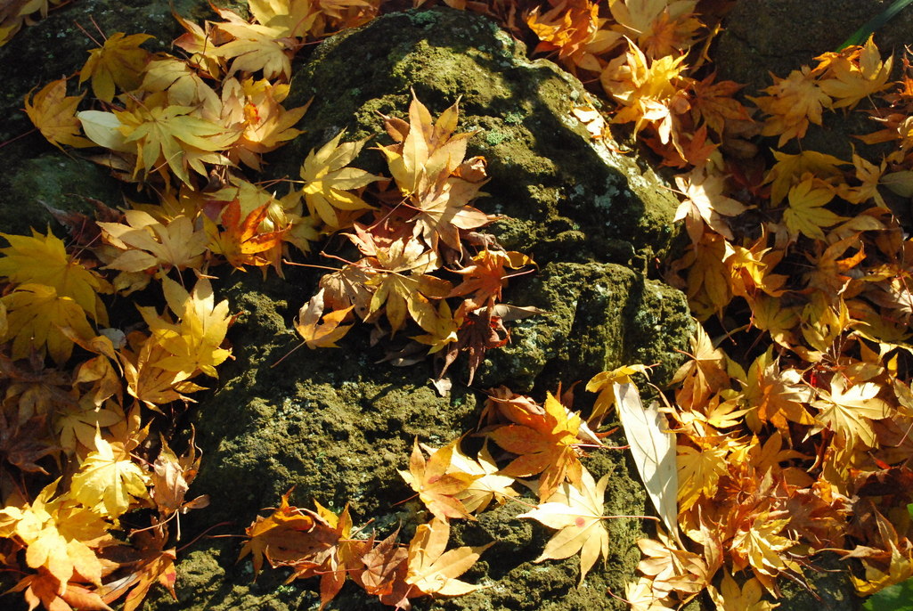 濡れた石の上に光るもみじの葉