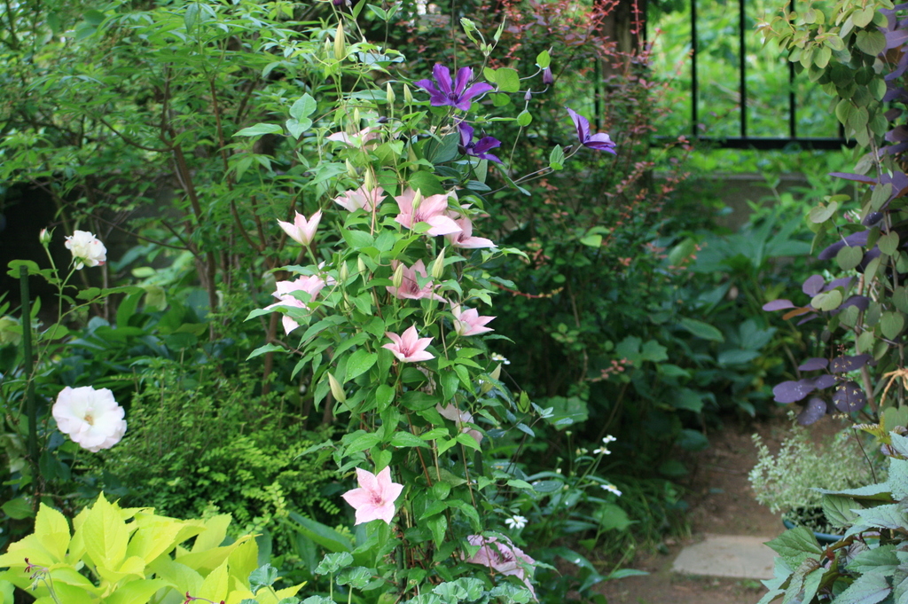 クレマチスは地植えですか? 組み合わせが可愛いですね^^ 私は庭を作り始めた頃は雑木林じゃなくって、「森」又は「ジャングル」を目指してました(笑)